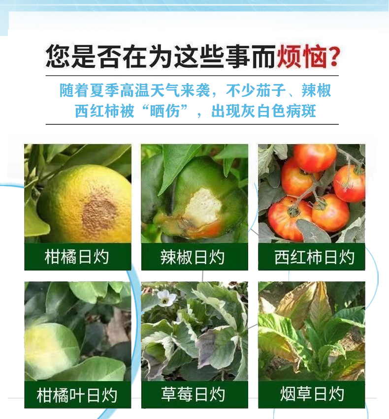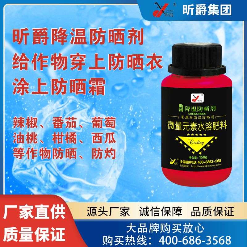 本品针对近年来气温升高,阳光直射强度强等问题、研制的作物抗高温和阳光灼伤等增产型保护剂。采用降温生物酶、***钨元素与多种微量元素螯合而成,使用后在作物表面形成肉眼看不到的防晒膜,就像给作物涂了防晒霜,能有效起到折射和阻碍阳光作用,舒缓紫外线过强造成的作物叶片、茎秆、花蕊、果实等的灼伤。并且可以有效调节作物叶片和果皮气孔闭合。在阳光照射过强时,及时调节叶片气孔闭合,减少叶片水分蒸腾,预防作物因水分蒸发量过大而脱水黄叶甚至死亡。同时增加作物营养,提高果蔬品质及产量,对高温日灼后作物能尽快回复长势,保护作物减轻高温日灼带来的危害。